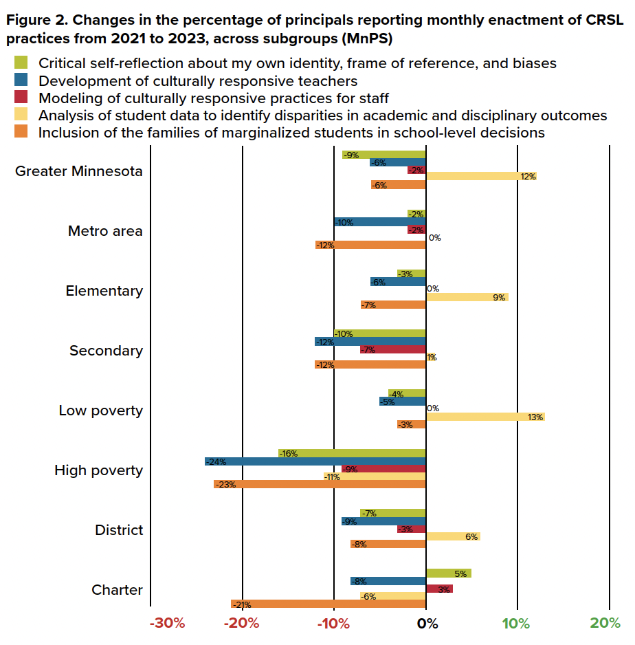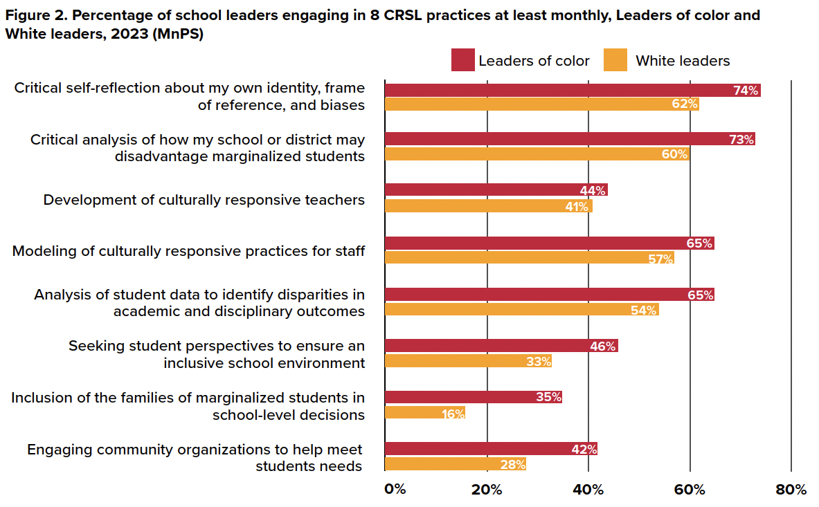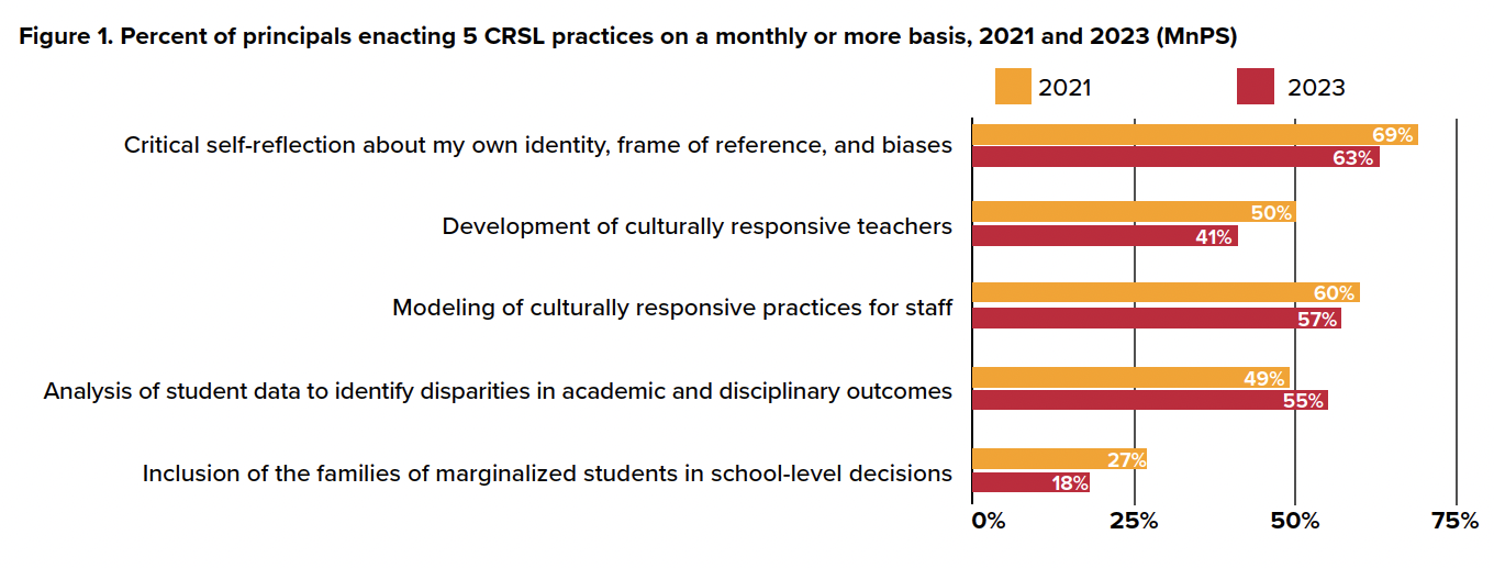 This brief summarizes MnPS and follow-up focus group findings on Culturally Responsive School Leadership (CRSL). First, it offers a definition of CRSL from research and explains why it matters. Second, it presents key findings from the MnPS about declines from 2021 to 2023 in both principals’ self-efficacy in practicing select CRSL activities, and the frequency with which they enact CRSL practices. Lastly, the brief summarizes what we learned from focus group participants related to CRSL and what they need to more regularly enact it.